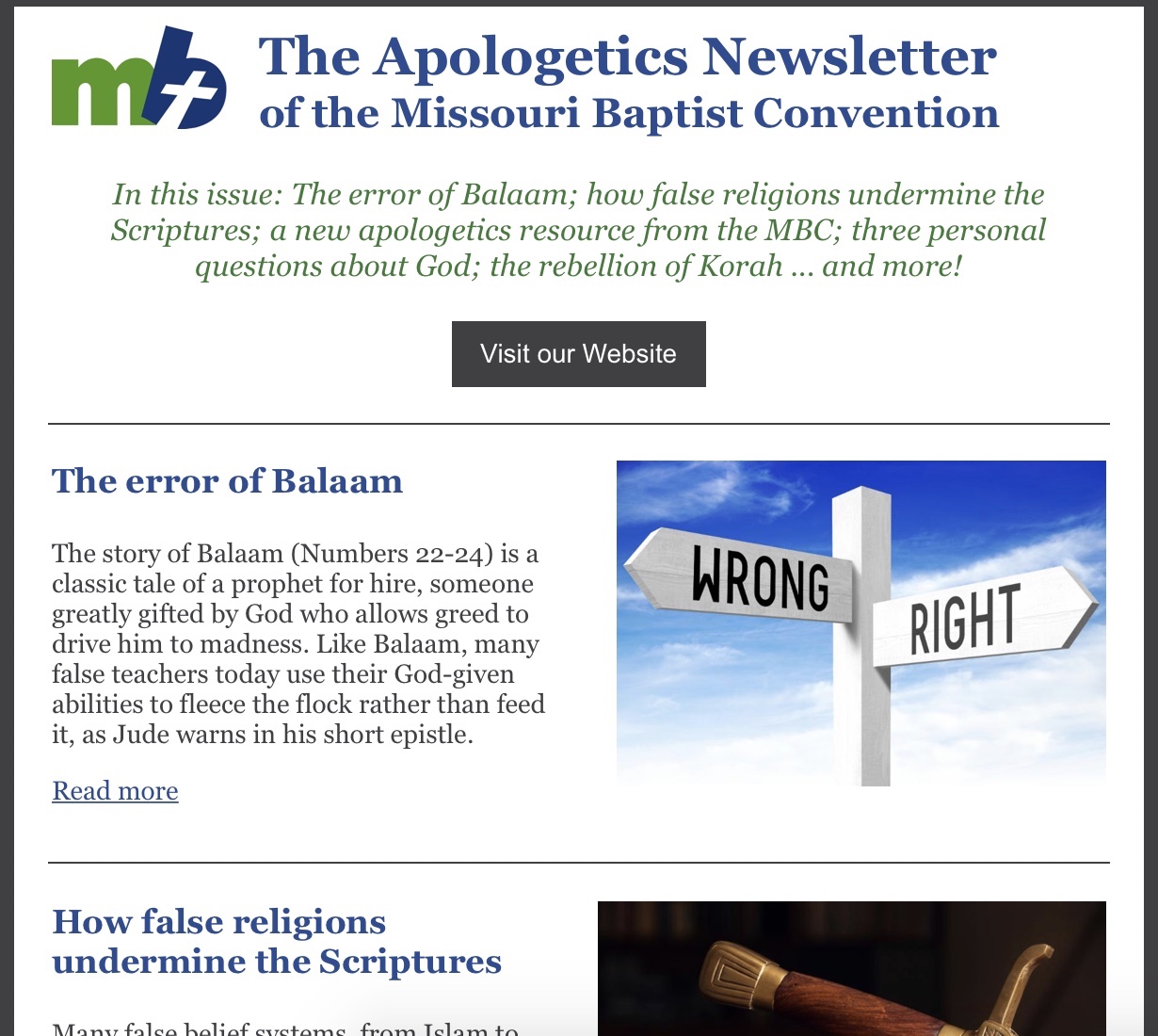 November – (1) Article IV-A of The Baptist Faith & Message: Regeneration; (2) The angel of the Lord appears to Gideon; (3) Article IV-B of The Baptist Faith & Message: Justification; (4) Interview: Jesus Before Bethlehem; (5) A man with no name; (6) Study The Baptist Faith & Message; (7) Get the MBC Apologetics Journal and Directory.