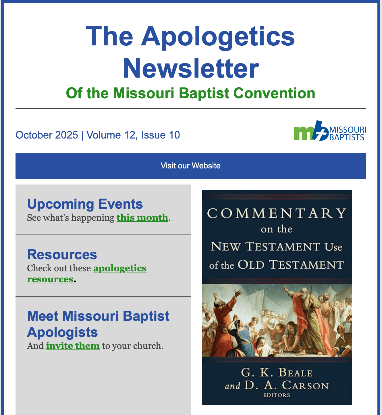October – (1) Commander of the Lord’s army; (2) What you should know about Satan; (3) Article IV of The Baptist Faith & Message: Salvation; (4) The angel of the Lord in the time of the judges; (5) A new release from High Street Press; (6) Get the new MBC Apologetics Journal and Directory.